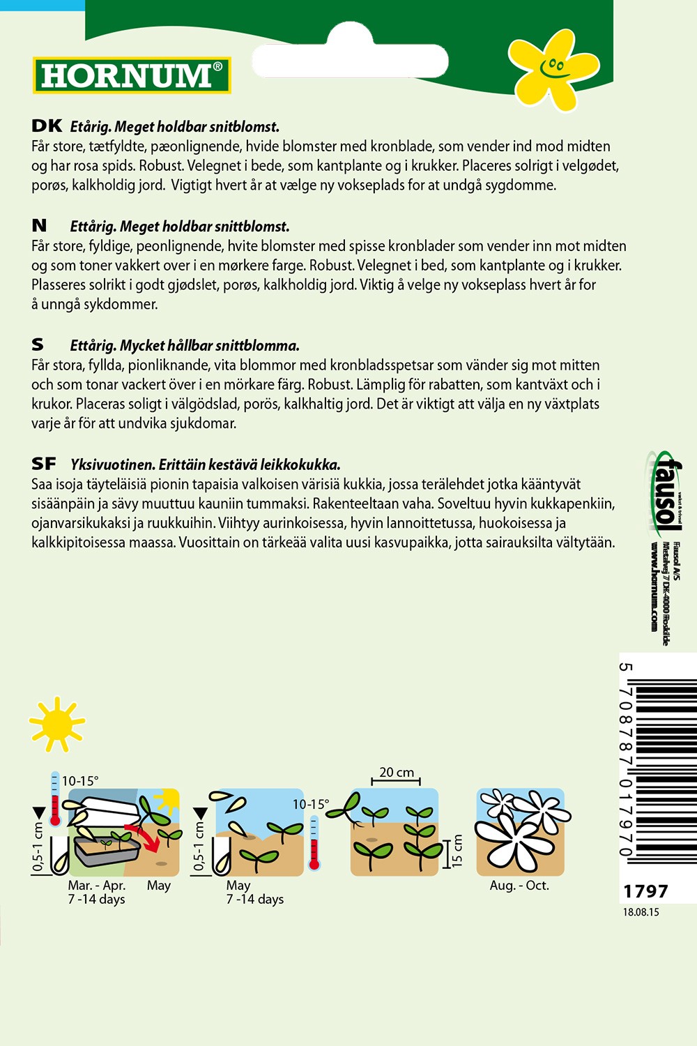Får store, tætfyldte, pæonlignende, hvide blomster med kronblade, som vender ind mod midten og har rosa spids. Robust. Velegnet i bede, som kantplante og i krukker. Placeres solrigt i velgødet, porøs, kalkholdig jord. Vigtigt hvert år at vælge ny vokseplads for at undgå sygdomme.