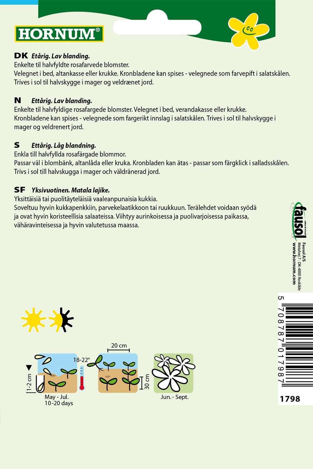 Enkelte til halvfyldte rosafarvede blomster. Velegnet i bed, altankasse eller krukke. Kronbladene kan spises - velegnede som farvepift i salatskålen. Trives i sol til halvskygge i mager og veldrænet jord.