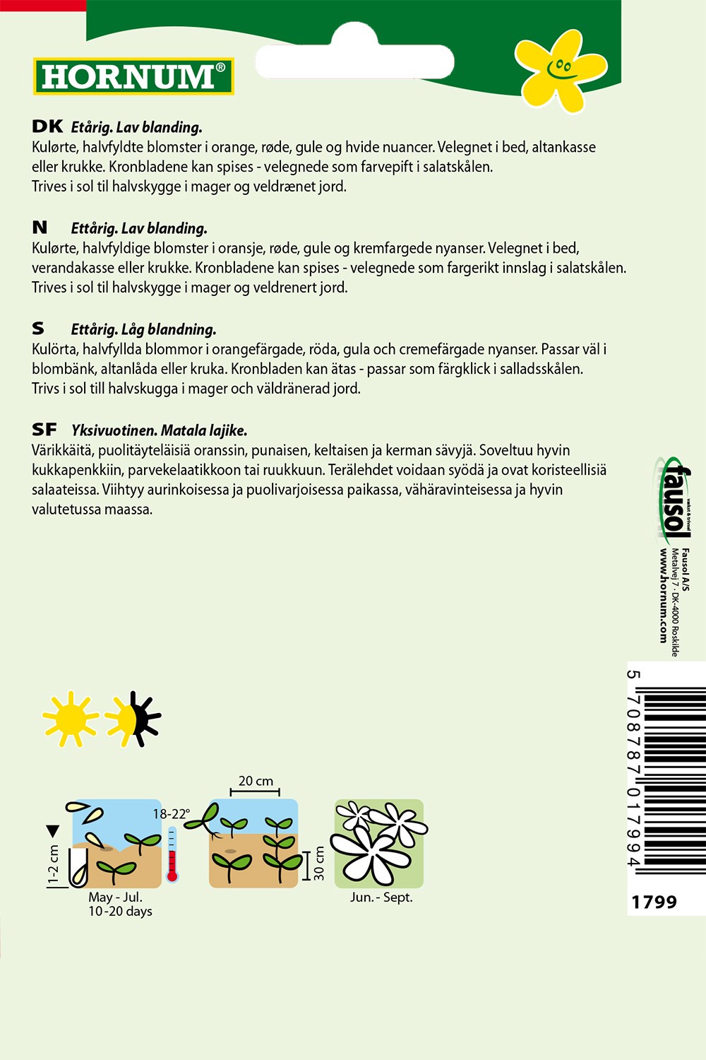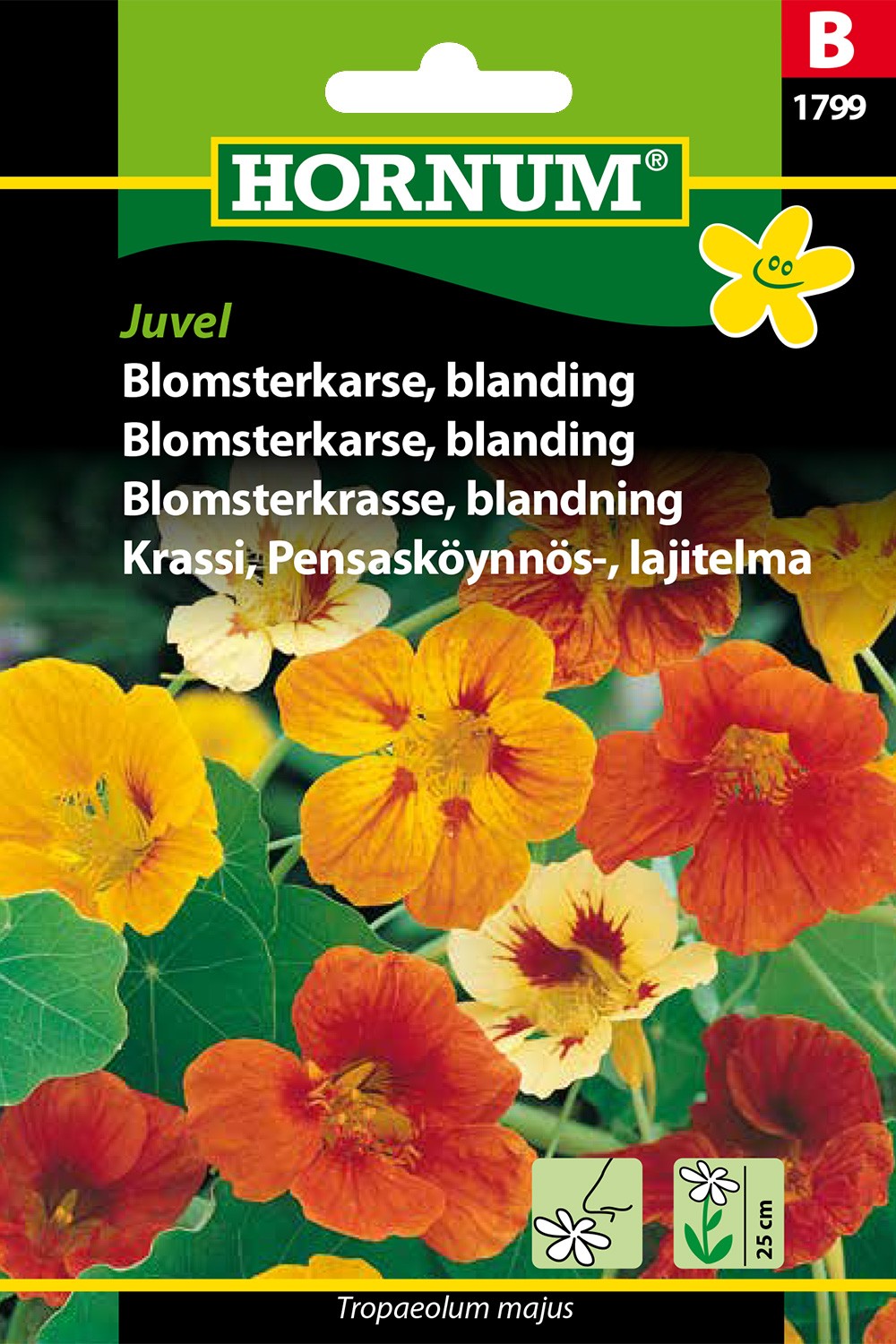 Kulørte, halvfyldte blomster i orange, røde, gule og hvide nuancer. Velegnet i bed, altankasse eller krukke. Kronbladene kan spises - velegnede som farvepift i salatskålen. Trives i sol til halvskygge i mager og veldrænet jord.