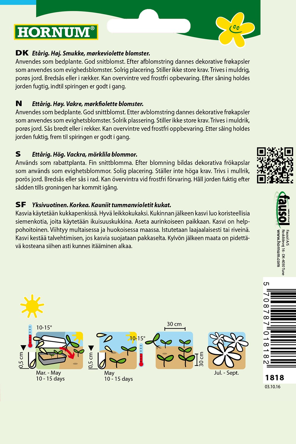 Anvendes som bedplante. God snitblomst. Efter afblomstring dannes dekorative frøkapsler som anvendes som evighedsblomster. Solrig placering. Stiller ikke store krav. Trives i muldrig, porøs jord. Bredsås eller i rækker. Kan overvintre ved frostfri opbevaring.