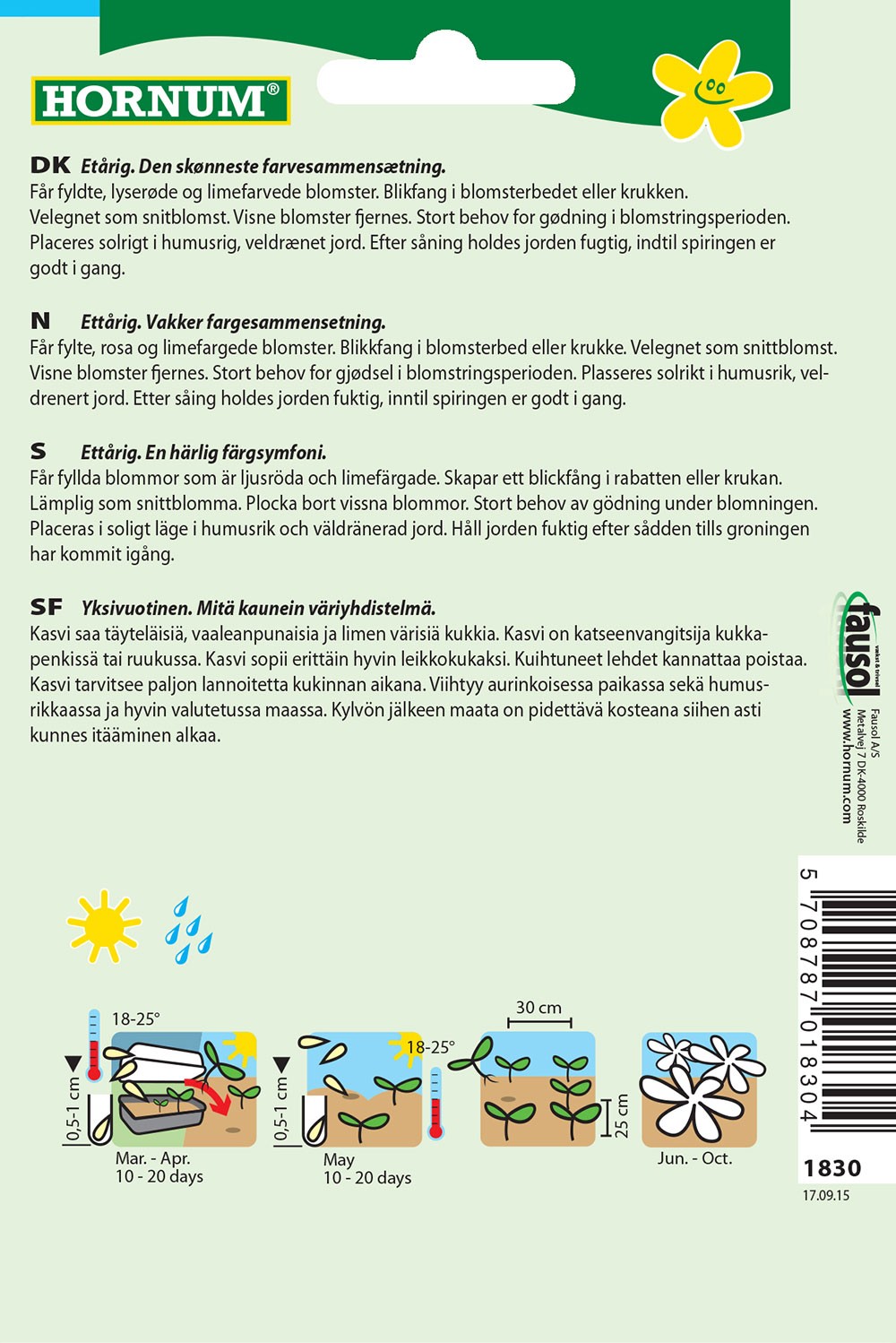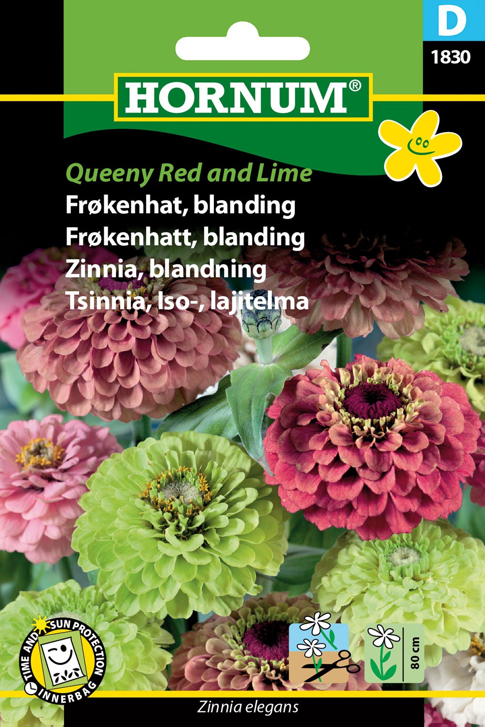 Får fyldte, lyserøde og limefarvede blomster. Blikfang i blomsterbedet eller krukken. Velegnet som snitblomst. Visne blomster fjernes. Stort behov for gødning i blomstringsperioden. Placeres solrigt i humusrig, veldrænet jord. Efter såning holdes jorden fugtig, indtil spiringen er godt i gang.