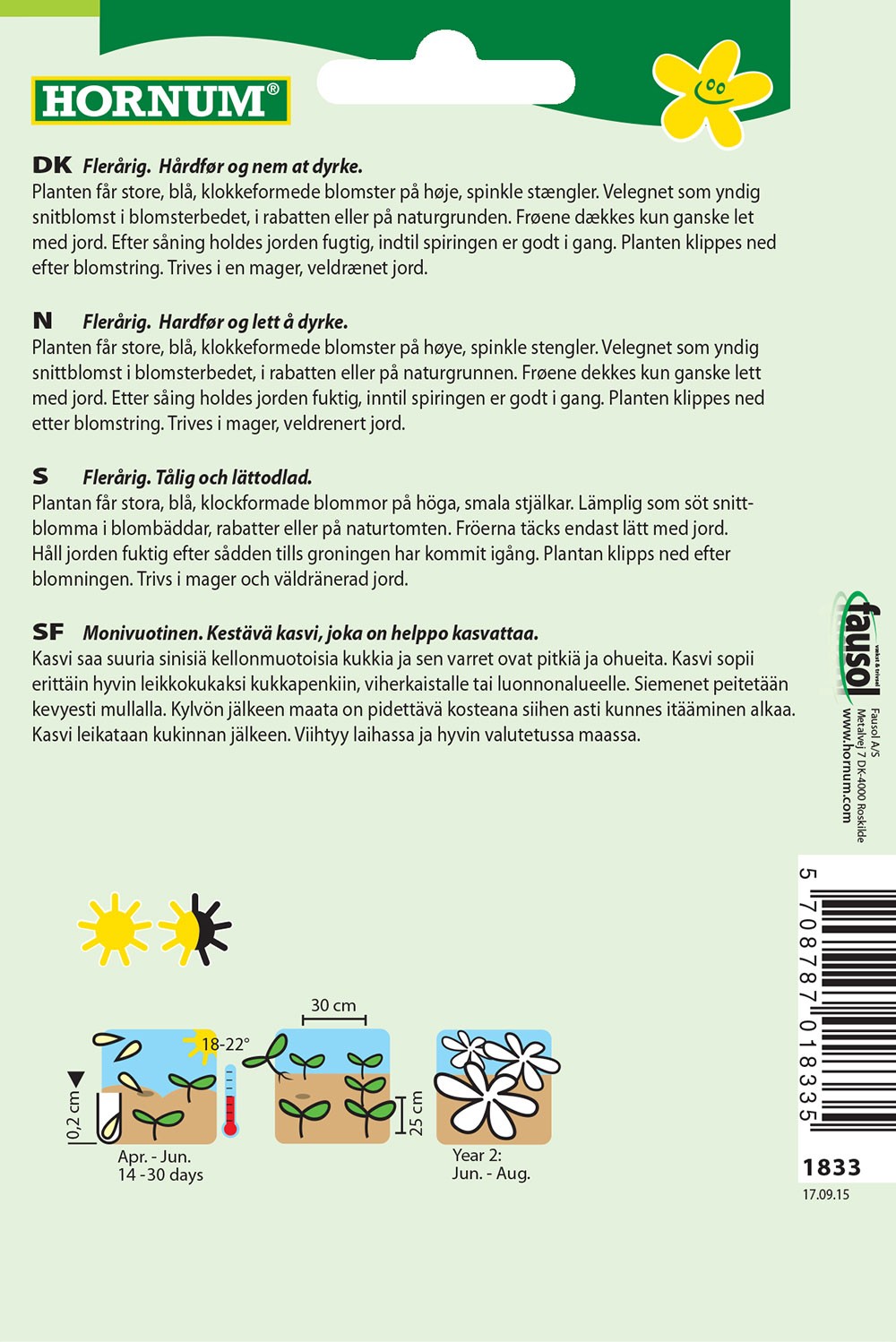 Planten får store, blå, klokkeformede blomster på høje, spinkle stængler. Velegnet som yndig snitblomst i blomsterbedet, i rabatten eller på naturgrunden. Frøene dækkes kun ganske let med jord. Efter såning holdes jorden fugtig, indtil spiringen er godt i gang. Planten klippes ned efter blomstring. Trives i en mager, veldrænet jord.