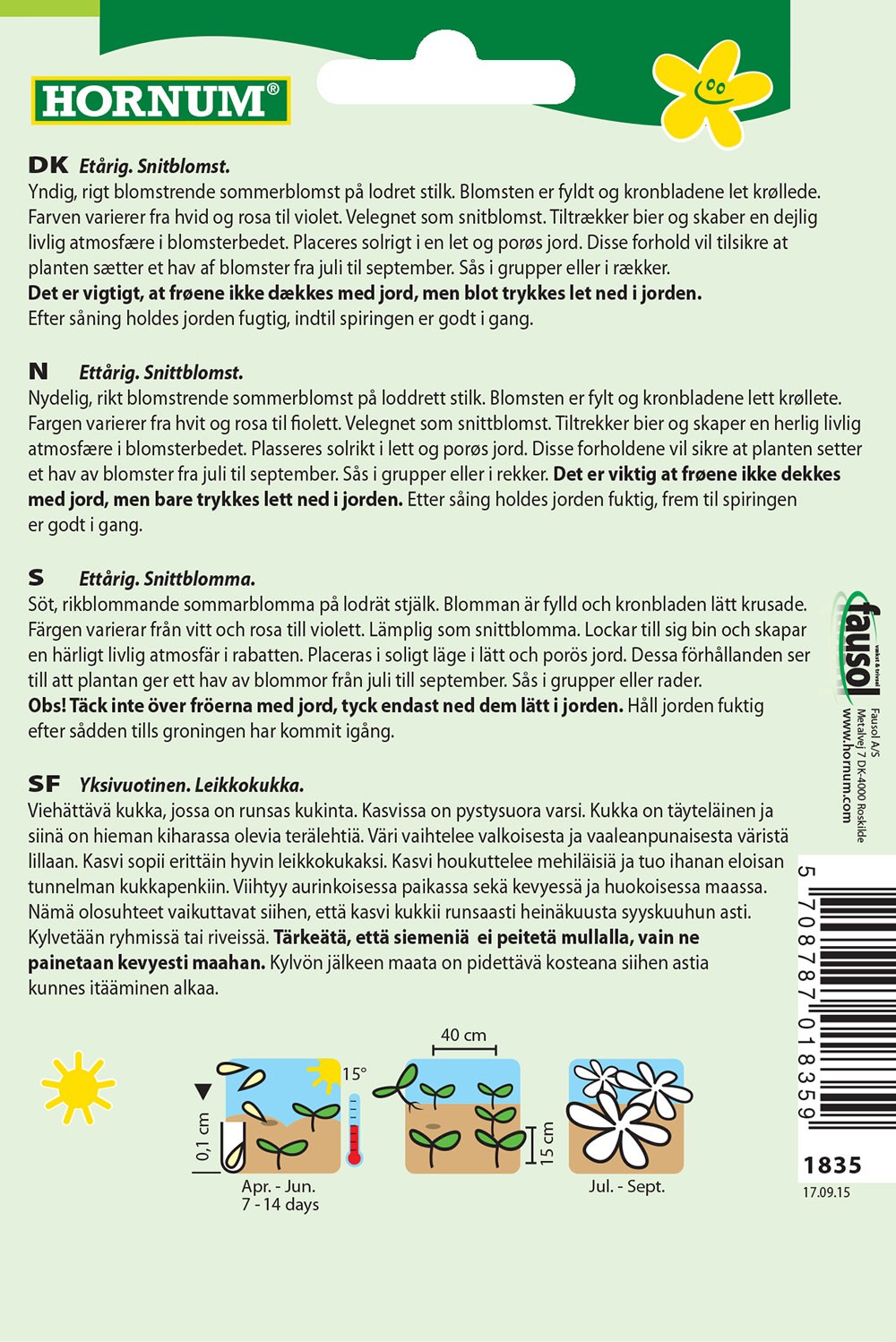 Yndig, rigt blomstrende sommerblomst på lodret stilk. Blomsten er fyldt og kronbladene let krøllede. Farven varierer fra hvid og rosa til violet. Velegnet som snitblomst. Tiltrækker bier og skaber en dejlig livlig atmosfære i blomsterbedet. Placeres solrigt i en let og porøs jord. Disse forhold vil tilsikre at planten sætter et hav af blomster fra juli til september. Sås i grupper eller i rækker. Det er vigtigt, at frøene ikke dækkes med jord, men blot trykkes let ned i jorden. Efter såning holdes jorden fugtig, indtil spiringen er godt i gang.