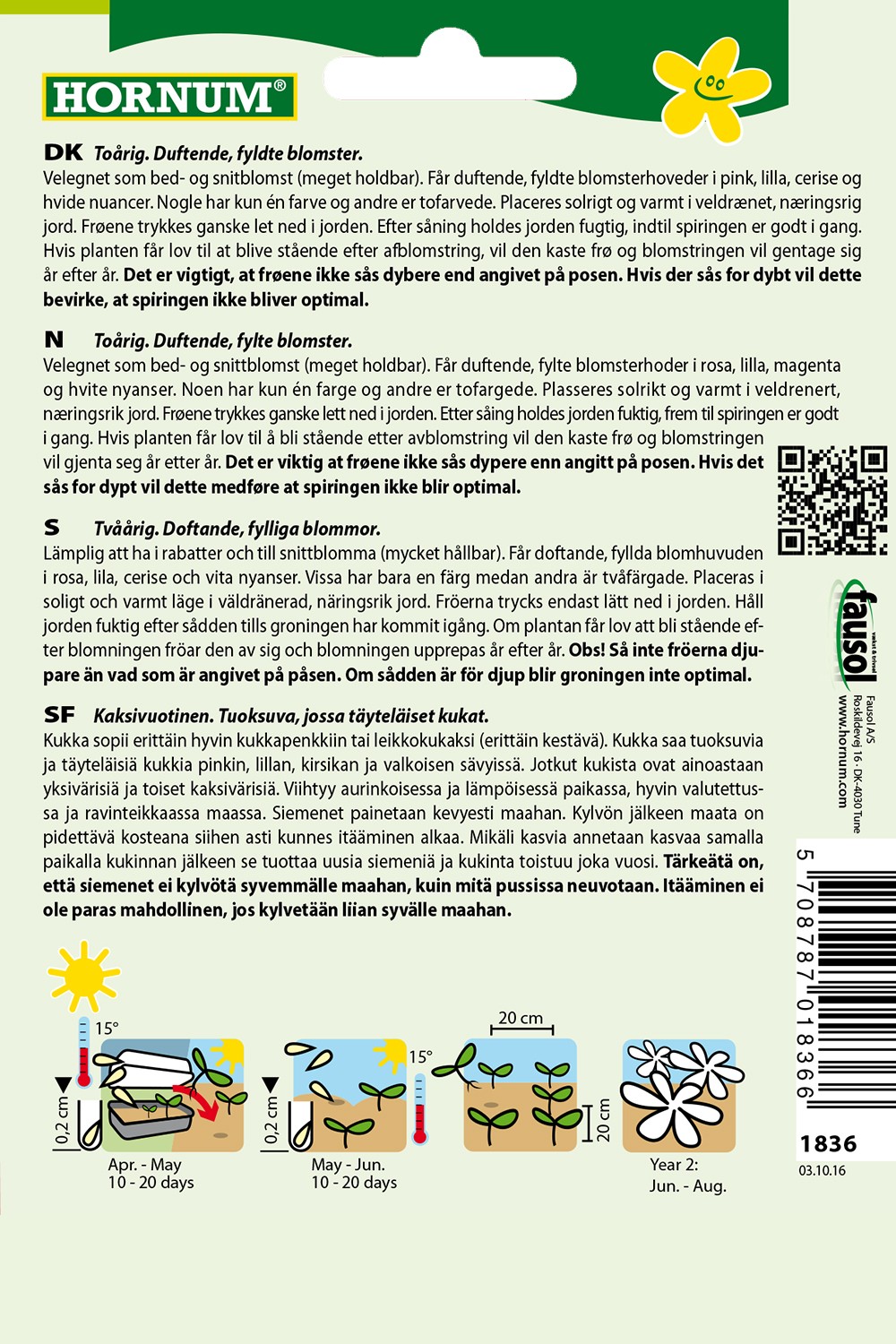 Velegnet som bed- og snitblomst (meget holdbar). Får duftende, fyldte blomsterhoveder i pink, lilla, cerise og hvide nuancer. Nogle har kun én farve og andre er tofarvede. Placeres solrigt og varmt i veldrænet, næringsrig jord. Frøene trykkes ganske let ned i jorden. Efter såning holdes jorden fugtig, indtil spiringen er godt i gang. Hvis planten får lov til at blive stående efter afblomstring, vil den kaste frø og blomstringen vil gentage sig år efter år. Det er vigtigt, at frøene ikke sås dybere end angivet på posen. Hvis der sås for dybt vil dette bevirke, at spiringen ikke bliver optimal.