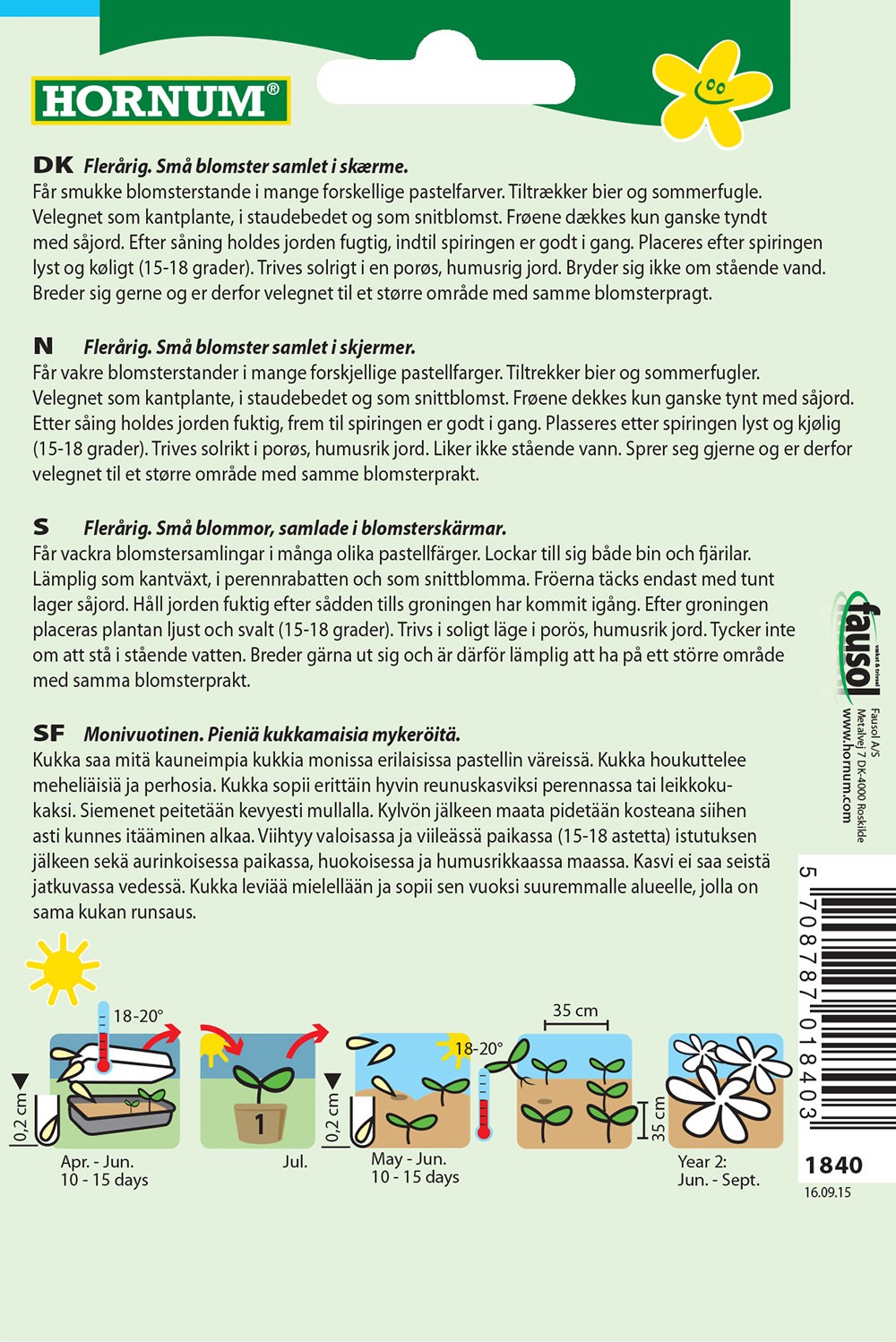 Får smukke blomsterstande i mange forskellige pastelfarver. Tiltrækker bier og sommerfugle. Velegnet som kantplante, i staudebedet og som snitblomst. Frøene dækkes kun ganske tyndt med såjord. Efter såning holdes jorden fugtig, indtil spiringen er godt i gang. Placeres efter spiringen lyst og køligt (15-18 grader). Trives solrigt i en porøs, humusrig jord. Bryder sig ikke om stående vand. Breder sig gerne og er derfor velegnet til et større område med samme blomsterpragt.