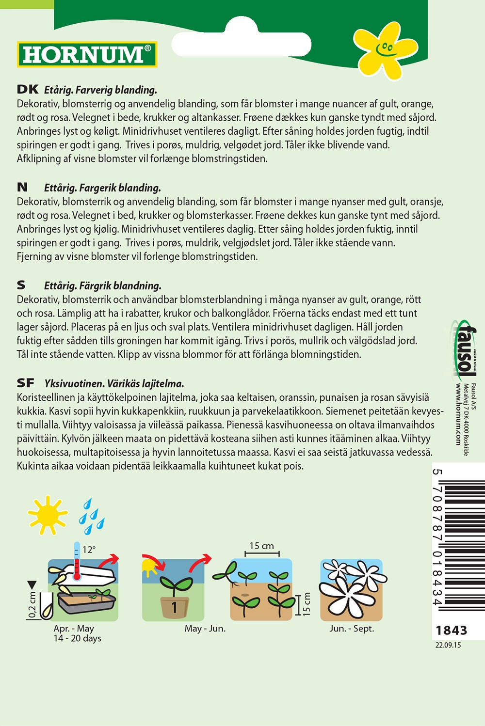 Dekorativ, blomsterrig og anvendelig blanding, som får blomster i mange nuancer af gult, orange, rødt og rosa. Velegnet i bede, krukker og altankasser. Frøene dækkes kun ganske tyndt med såjord. Anbringes lyst og køligt. Minidrivhuset ventileres dagligt. Efter såning holdes jorden fugtig, indtil spiringen er godt i gang. Trives i porøs, muldrig, velgødet jord. Tåler ikke blivende vand. Afklipning af visne blomster vil forlænge blomstringstiden.
