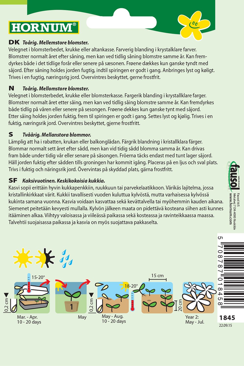 Velegnet i blomsterbedet, krukke eller altankasse. Farverig blanding i krystalklare farver. Blomstrer normalt året efter såning, men kan ved tidlig såning blomstre samme år. Kan fremdyrkes både i det tidlige forår eller senere på sæsonen. Frøene dækkes kun ganske tyndt med såjord. Efter såning holdes jorden fugtig, indtil spiringen er godt i gang. Anbringes lyst og køligt. Trives i en fugtig, næringsrig jord. Overvintres beskyttet, gerne frostfrit.