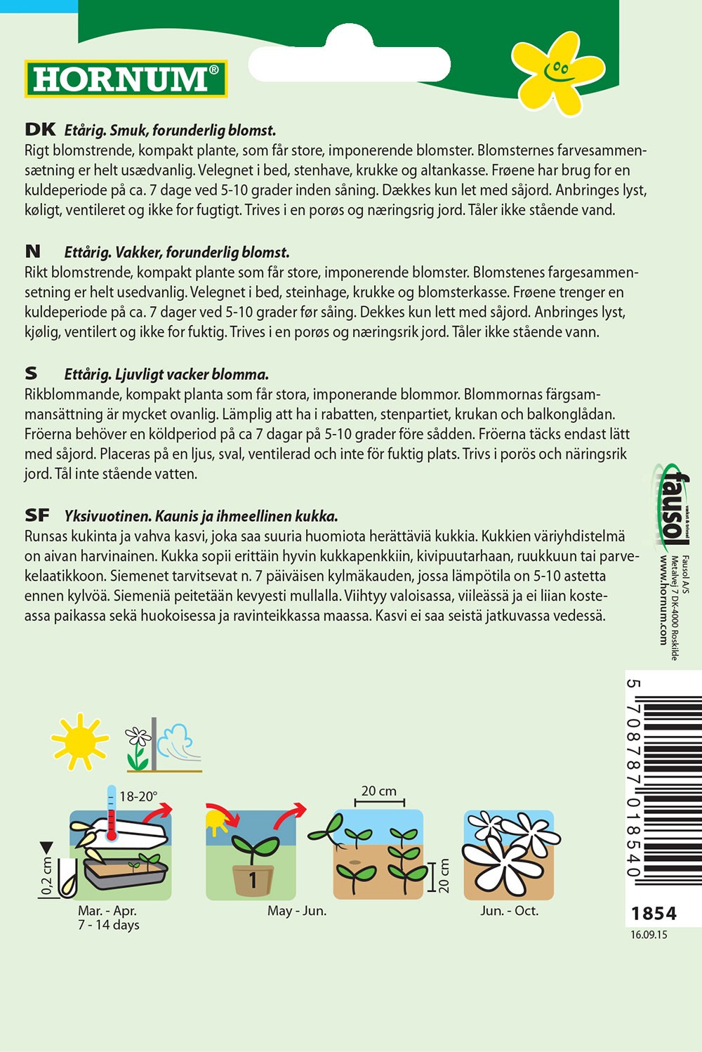 Rigt blomstrende, kompakt plante, som får store, imponerende blomster. Blomsternes farvesammensætning er helt usædvanlig. Velegnet i bed, stenhave, krukke og altankasse. Frøene har brug for en kuldeperiode på ca. 7 dage ved 5-10 grader inden såning. Dækkes kun let med såjord. Anbringes lyst, køligt, ventileret og ikke for fugtigt. Trives i en porøs og næringsrig jord. Tåler ikke stående vand.