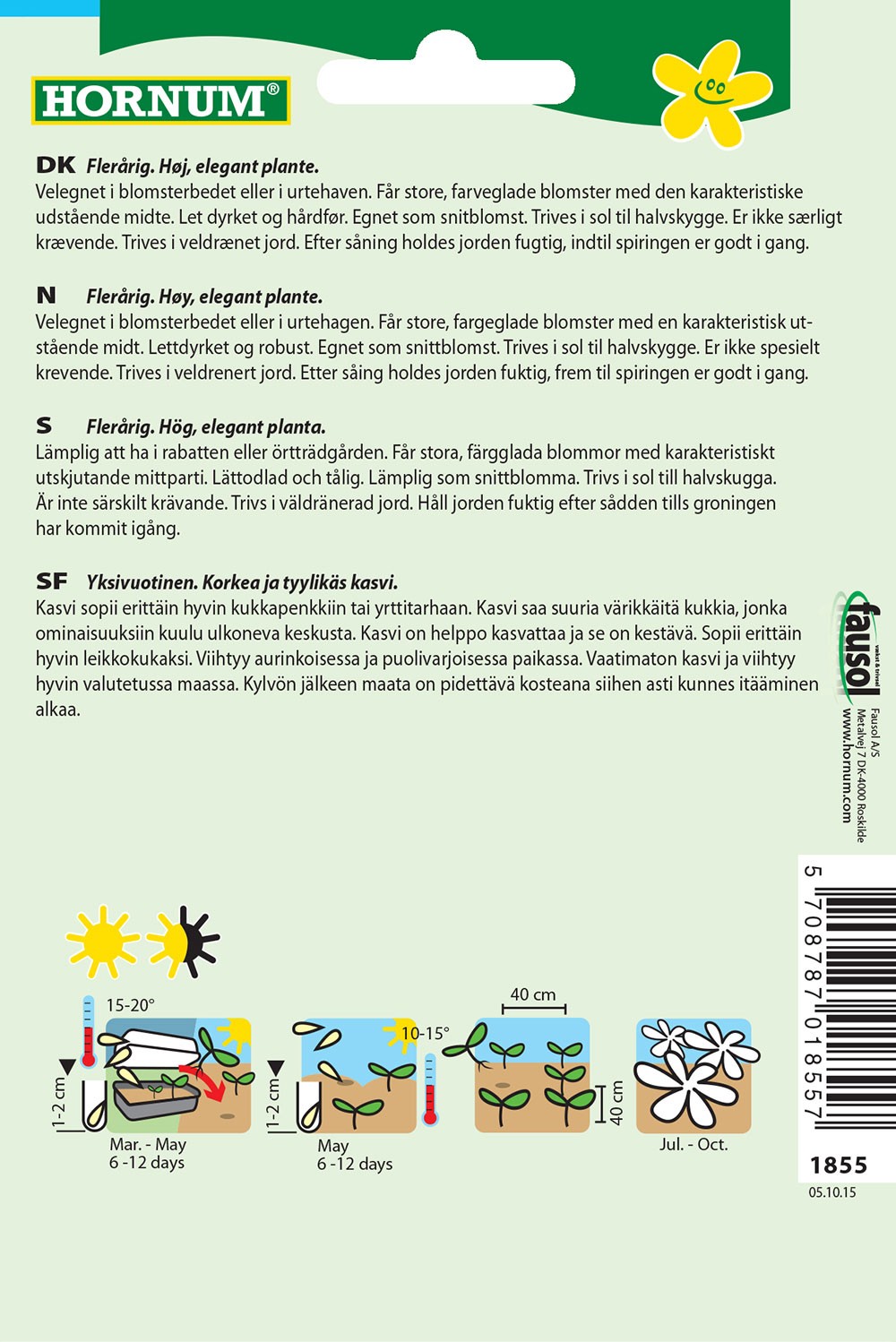 Velegnet i blomsterbedet eller i urtehaven. Får store, farveglade blomster med den karakteristiske udstående midte. Let dyrket og hårdfør. Egnet som snitblomst. Trives i sol til halvskygge. Er ikke særligt krævende. Trives i veldrænet jord. Efter såning holdes jorden fugtig, indtil spiringen er godt i gang.
