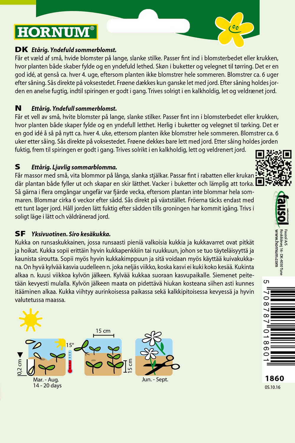 Får et væld af små, hvide blomster på lange, slanke stilke. Passer fint ind i blomsterbedet eller krukken, hvor planten både skaber fylde og en yndefuld lethed. Skøn i buketter og velegnet til tørring. Det er en god idé, at genså ca. hver 4. uge, eftersom planten ikke blomstrer hele sommeren. Blomstrer ca. 6 uger efter såning. Sås direkte på voksestedet. Frøene dækkes kun ganske let med jord. Efter såning holdes jorden en anelse fugtig, indtil spiringen er godt i gang. Trives solrigt i en kalkholdig, let og veldrænet jord.
