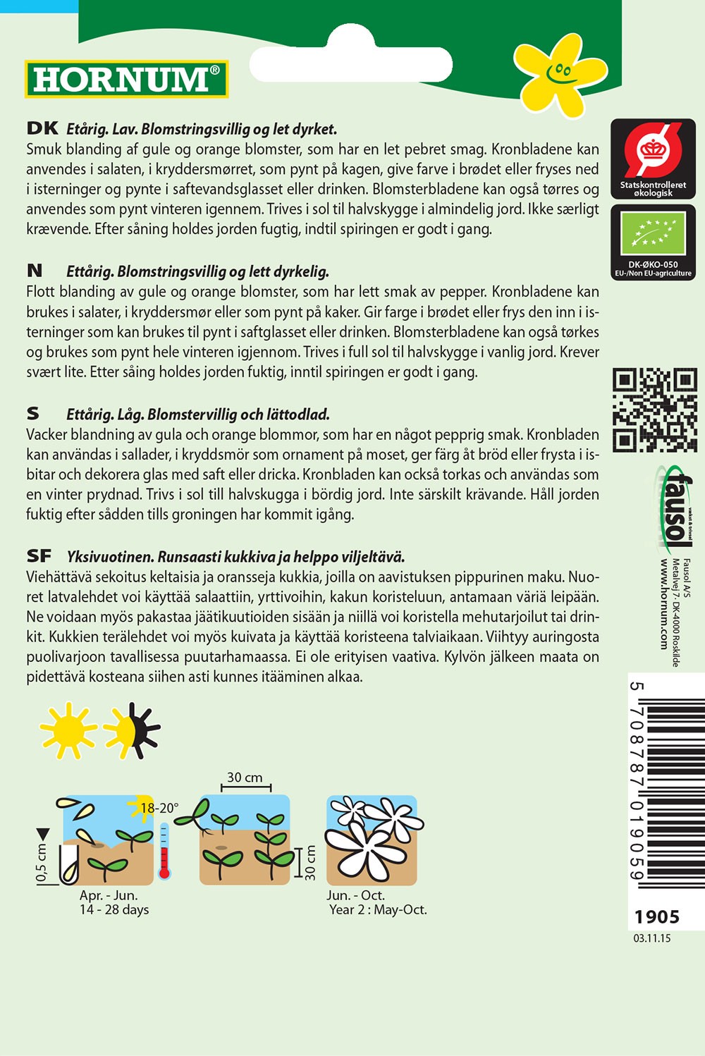Smuk blanding af gule og orange blomster, som har en let pebret smag. Kronbladene kan anvendes i salaten, i kryddersmørret, som pynt på kagen, give farve i brødet eller fryses ned i isterninger og pynte i saftevandsglasset eller drinken. Blomsterbladene kan også tørres og anvendes som pynt vinteren igennem. Trives i sol til halvskygge i almindelig jord. Ikke særligt krævende. Efter såning holdes jorden fugtig, indtil spiringen er godt i gang.