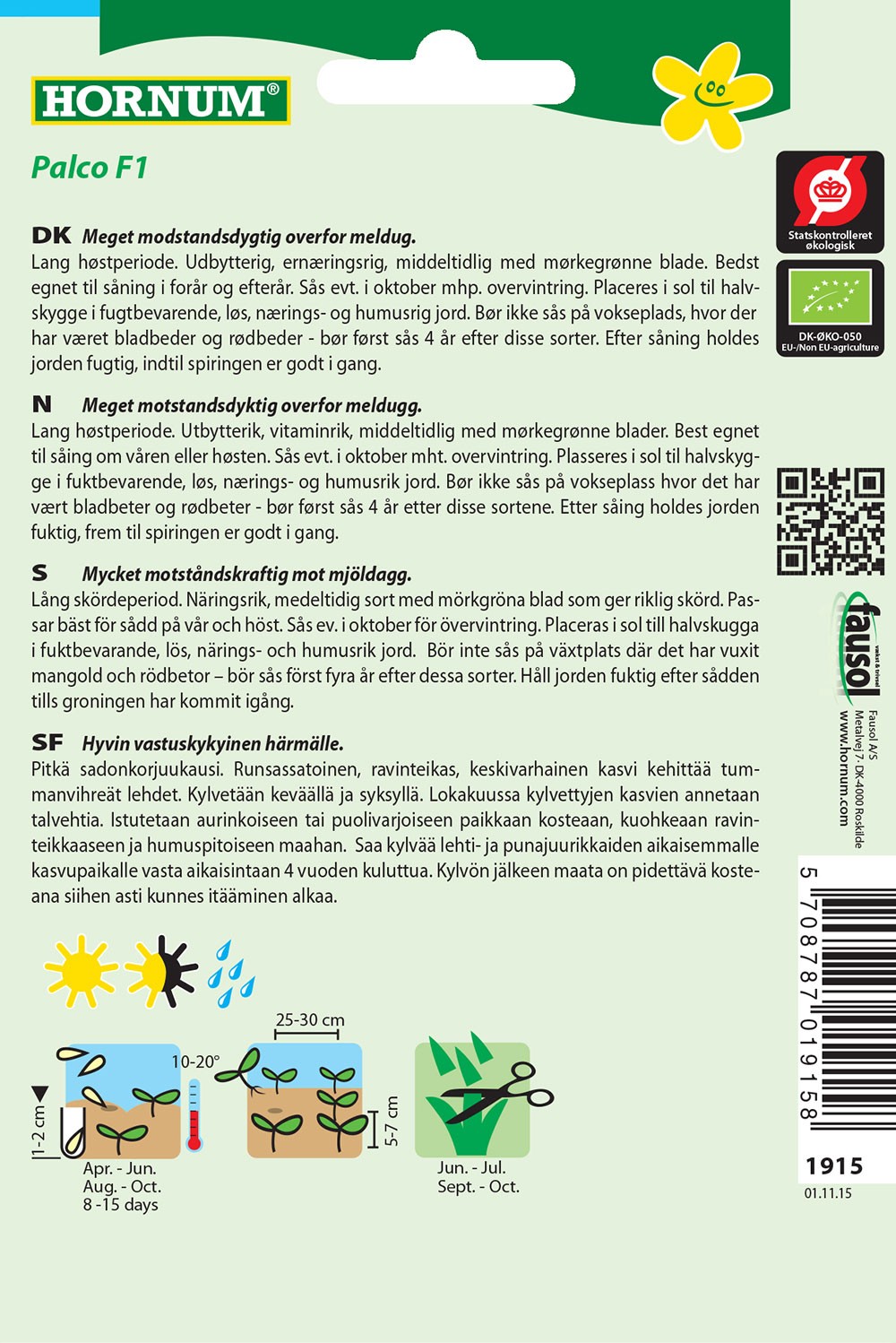 Lang høstperiode. Udbytterig, ernæringsrig, middeltidlig med mørkegrønne blade. Bedst egnet til såning i forår og efterår. Sås evt. i oktober mhp. overvintring. Placeres i sol til halvskygge i fugtbevarende, løs, nærings- og humusrig jord. Bør ikke sås på vokseplads, hvor der har været bladbeder og rødbeder - bør først sås 4 år efter disse sorter. Efter såning holdes jorden fugtig, indtil spiringen er godt i gang.