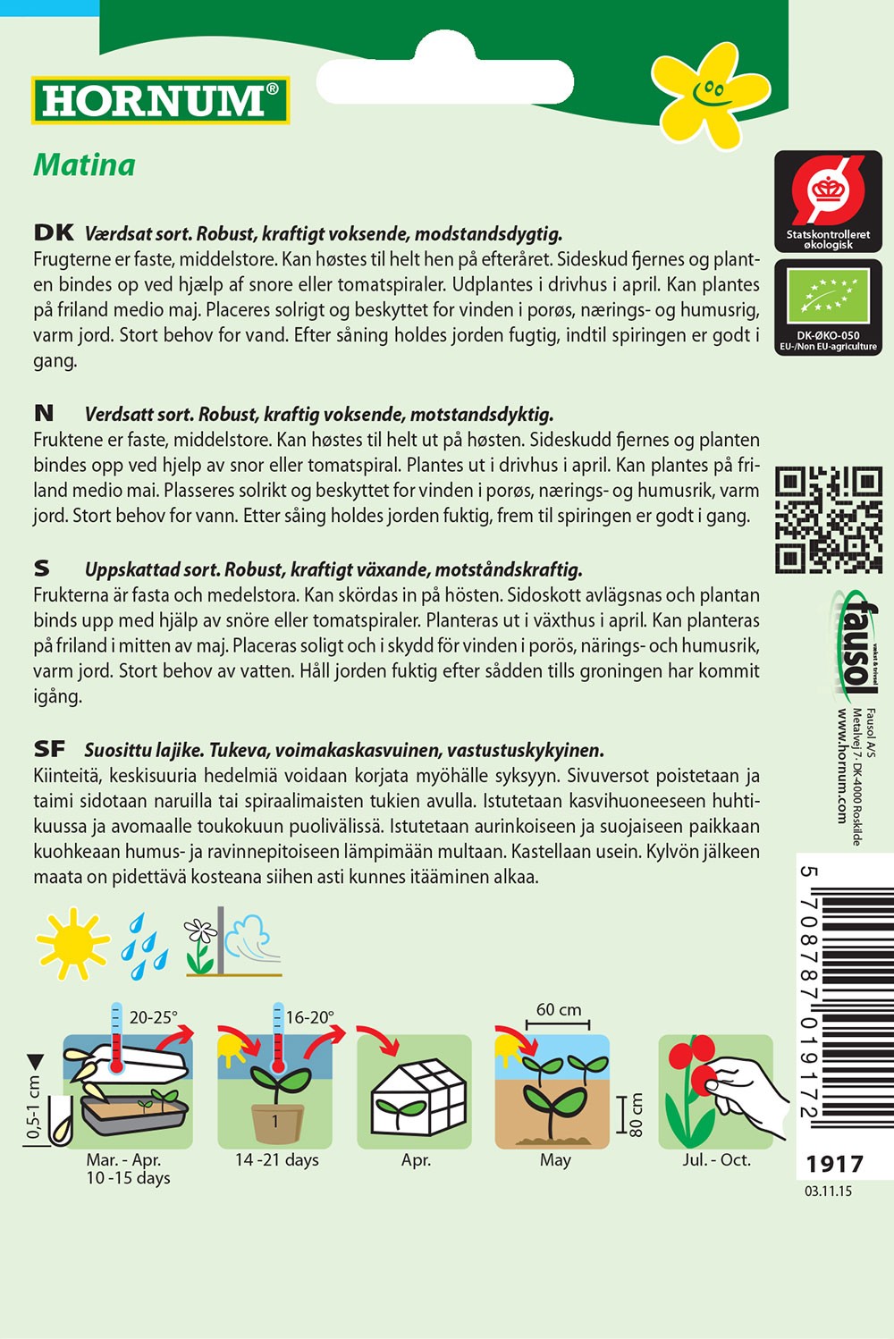 Frugterne er faste, middelstore. Kan høstes til helt hen på efteråret. Sideskud fjernes og planten bindes op ved hjælp af snore eller tomatspiraler. Udplantes i drivhus i april. Kan plantes på friland medio maj. Placeres solrigt og beskyttet for vinden i porøs, nærings- og humusrig, varm jord. Stort behov for vand. Efter såning holdes jorden fugtig, indtil spiringen er godt i gang.
