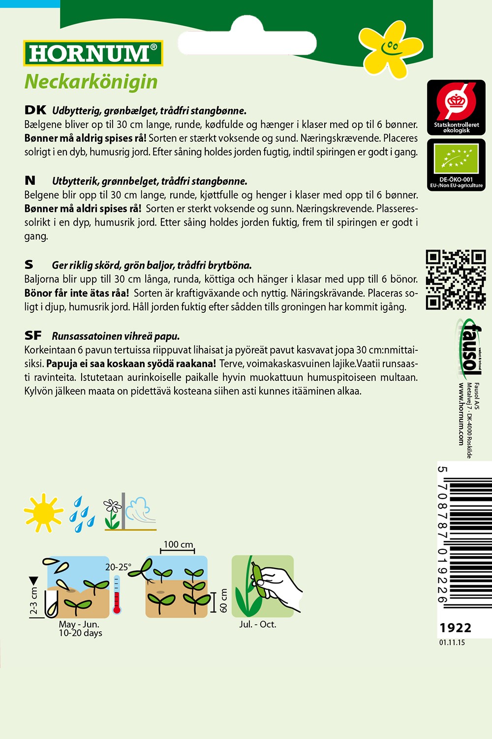 Bælgene bliver op til 30 cm lange, runde, kødfulde og hænger i klaser med op til 6 bønner. Bønner må aldrig spises rå! Sorten er stærkt voksende og sund. Næringskrævende. Placeressolrigt i en dyb, humusrig jord. Efter såning holdes jorden fugtig, indtil spiringen er godt i gang.
