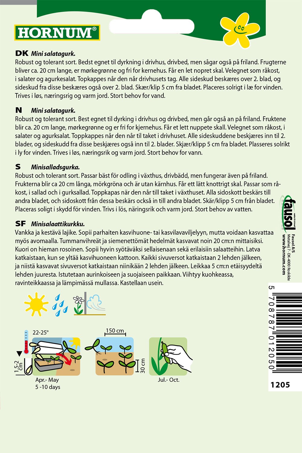 Robust og tolerant sort. Bedst egnet til dyrkning i drivhus, drivbed, men sågar også på friland. Frugterne bliver ca. 20 cm lange, er mørkegrønne og fri for kernehus. Får en let nopret skal. Velegnet som råkost, i salater og agurkesalat. Topkappes når den når drivhusets tag. Alle sideskud beskæres over 2. blad, og sideskud fra disse beskæres også over 2. blad. Skær/klip 5 cm fra bladet. Placeres solrigt i læ for vinden. Trives i løs, næringsrig og varm jord. Stort behov for vand.