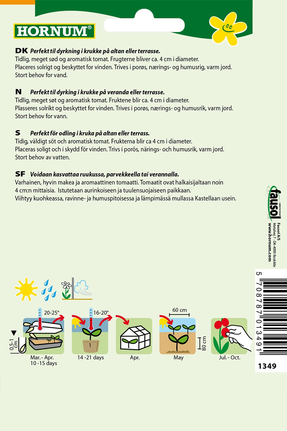 Tidlig, meget sød og aromatisk tomat. Frugterne bliver ca. 4 cm i diameter. Placeres solrigt og beskyttet for vinden. Trives i porøs, nærings- og humusrig, varm jord. Stort behov for vand.
