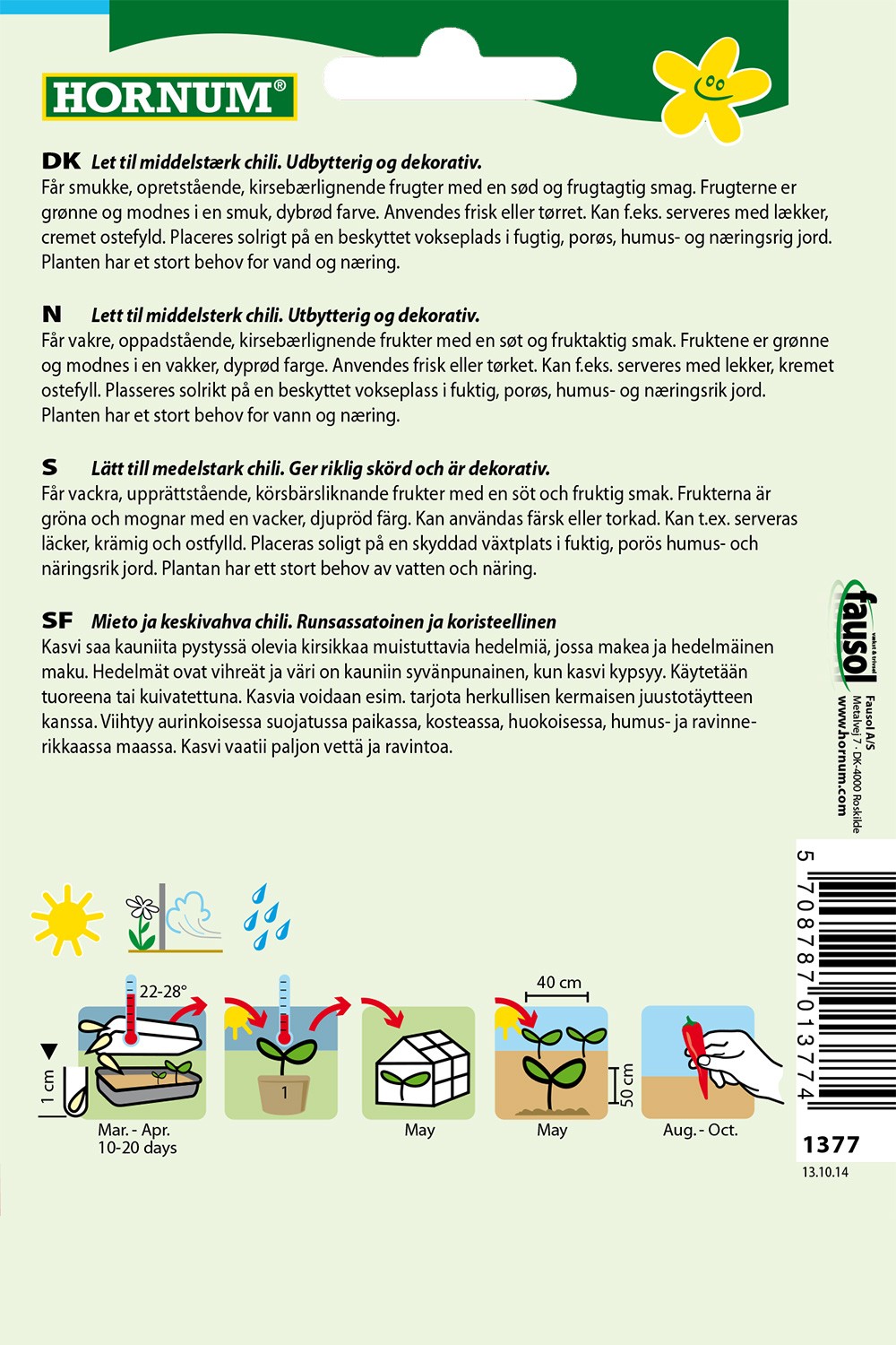 Får smukke, opretstående, kirsebærlignende frugter med en sød og frugtagtig smag. Frugterne er grønne og modnes i en smuk, dybrød farve. Anvendes frisk eller tørret. Kan f.eks. serveres med lækker, cremet ostefyld. Placeres solrigt på en beskyttet vokseplads i fugtig, porøs, humus- og næringsrig jord. Planten har et stort behov for vand og næring.
