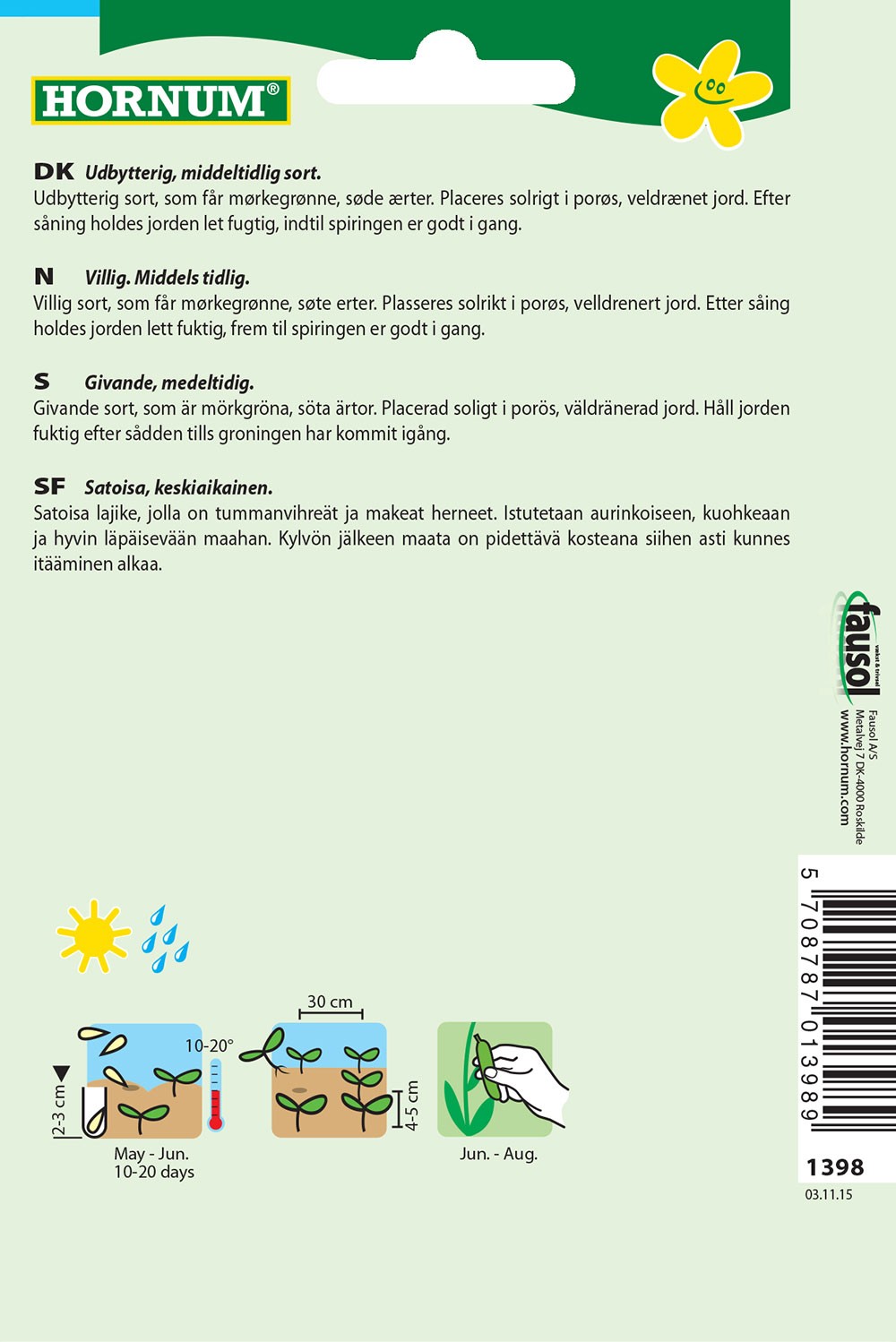 Udbytterig sort, som får mørkegrønne, søde ærter. Placeres solrigt i porøs, veldrænet jord. Efter såning holdes jorden let fugtig, indtil spiringen er godt i gang.