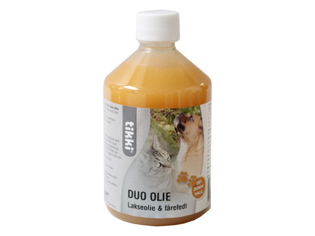 Tikki Duo olie er et velsmagende mix af lakseolie, fårefedt og solsikkeolie. Olien er velegnet til både hunde og katte.